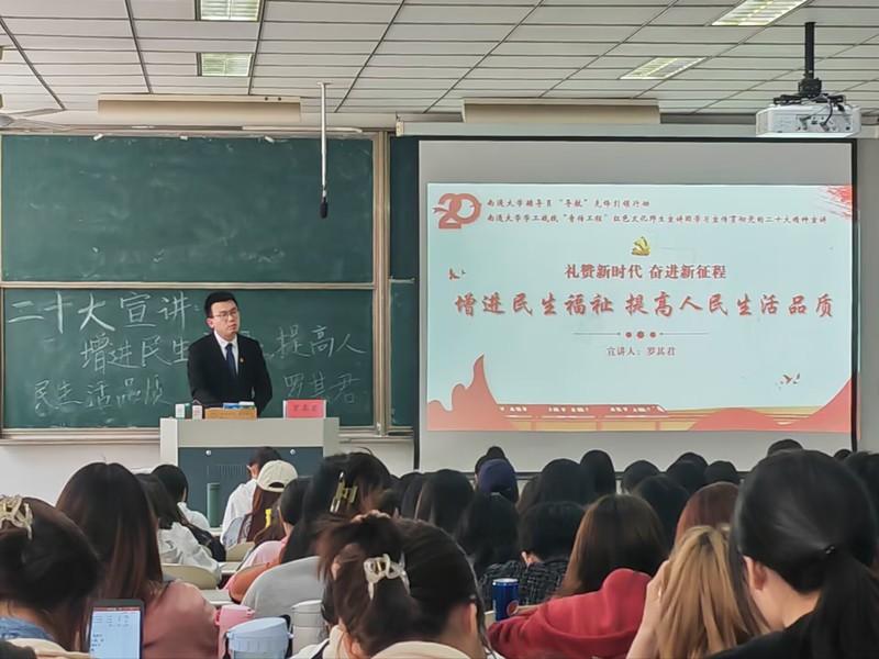 师生宣讲团教师成员、辅导员罗其君以《增进民生福祉,提高人民生活品质》为题作宣讲报告,从完善分配制度、实施就业优先战略、健全社会保障体系、推进健康中国建设四个方面详细阐述了实现共同富裕的实施路径,介绍了党的十八大以来在增进民生福祉方面取得伟大成就及历史意义。