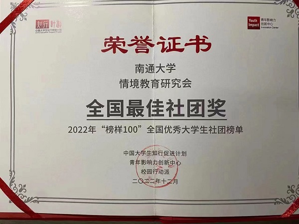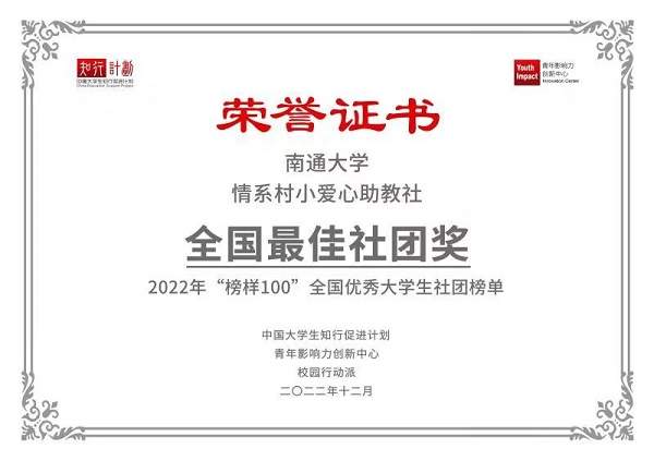 2022年“榜样100”全国优秀大学生社团榜单 正式发布。来自清华大学、北京大学、复旦大学、上海交通大学等170余所高校、590+社团/团队、360+优秀大学生上榜。ACG动漫 “情系村小爱心助教社”和“情境教育研究会”两支社团入围榜单。
