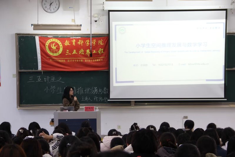 许添舒和同学们分享了空间推理相关的知识,阐明空间推理能力对儿童发展有着重要作用,尤其是数学学习等领域,并从空间推理的讲述延伸到了数学教育,通过对表象思维的阐述解开了同学们对空间推理能力在数学学习运用的疑惑。