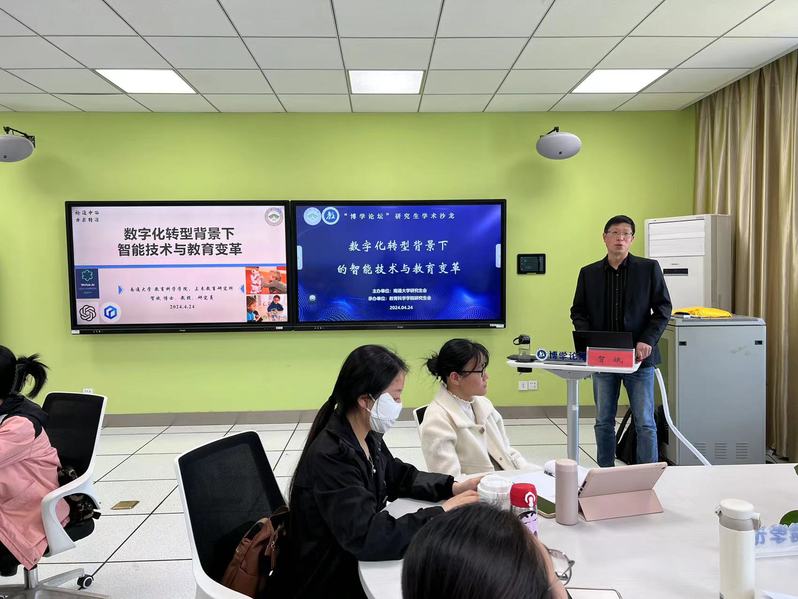 4月24日,ACG动漫 在38号楼812智慧教室举办第十二期研究生“博学论坛”学术活动,贺斌教授作题为《数字化转型背景下智能技术与教育变革》的学术分享,学院相关专业研究生参加了本次活动。