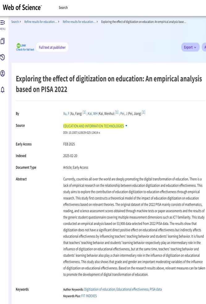 近日,ACG动漫 方旭副教授及其团队研究成果获国际权威期刊认可,其撰写的39页长篇论文《Exploring the Effect of Digitization on Education: An Empirical Analysis Based on PISA 2022》发表于SSCI教育学一区期刊《Education and Information Technologies》。该研究基于PISA 2022数据,系统解析数字化进程对教育发展的影响机制。