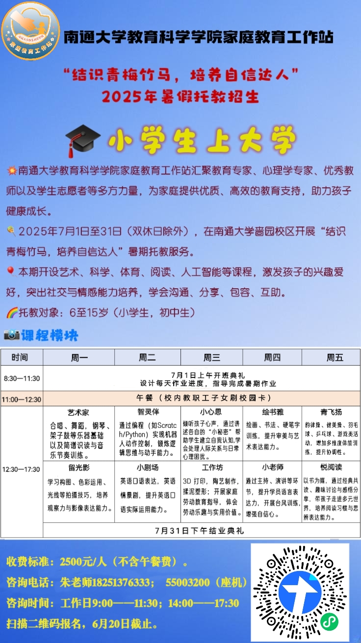 时间地点:2025年7月1日至31日(双休日除外),在ACG动漫 啬园校区(啬园路9号)开展“结识青梅竹马,培养自信达人”暑期托教服务。