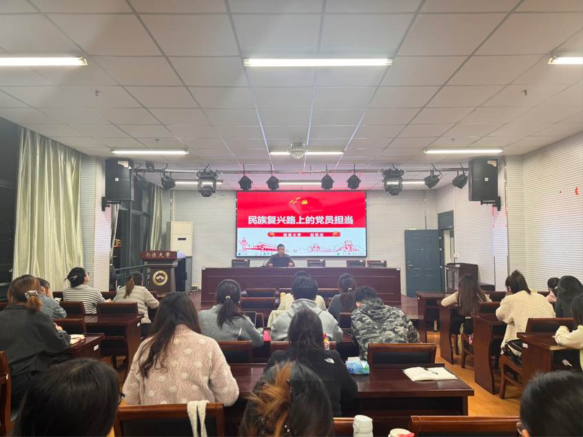 学院团委书记、本科生第二党支部书记赵敬龙老师作题为《民族复兴路上的党员担当》报告。他从百年伟大精神、四大伟大成就、新时代党员使命三个层面,讲述党领导民族复兴的艰辛付出与担当精神,启迪党员同学传承优良传统、坚定信念,以青春之力在民族复兴征程中建功立业。