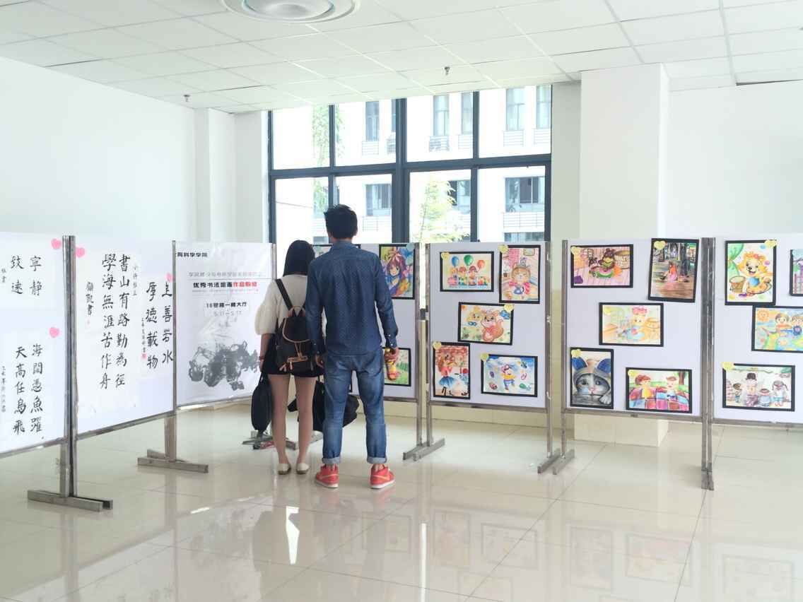 此次展出收集了教科院同学们的优秀书法绘画作品,其中书法作品分为软笔书法和硬笔书法两种,绘画作品则是由蜡笔创作的儿童画。书法作品的内容多为弘扬爱国精神与传递正能量,作者们用或细腻或刚健有力的笔触表达着他们对作品的独到理解。而绘画作品则用缤纷的色彩描绘出了童话中的场景,传达出了童趣与温馨。这些作品分类粘贴于展板上放置在大厅里,吸引了不少老师与学生的驻足。