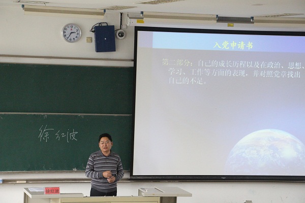 9月16号下午,学院党总支副书记徐红波就如何写入党申请书和思想汇报对2015级新生做了专题讲座,他强调信仰问题是每一个团员青年应该认真思考的问题,应该通过自己的一言一行来体现,加入党组织应该成为每一个要求进步的团员青年的追求。接着,徐书记详细讲解了入党申请书和思想汇报的书写规范以及注意事项等。