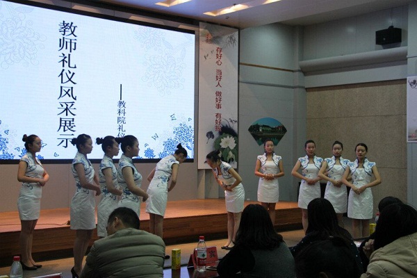 活动围绕诵一段诗篇、学一些知识、讲一个故事、做一次宣誓、作一番点评、唱一首歌曲等六个环节展开。极富情感的诗朗诵《唱给全国师德楷模——李吉林》诉说了学子们对老师的无限敬意;整齐端庄的教师礼仪表演展示了以德立人的文明风范;铿锵有力的宣誓声道出了准教师们的憧憬和决心;姿势优美的手语操《好大一棵树》演绎了教师的爱与奉献……我校师生用精彩纷呈的表演为现场观众描绘出一幅关于教育和奉献的唯美画卷。