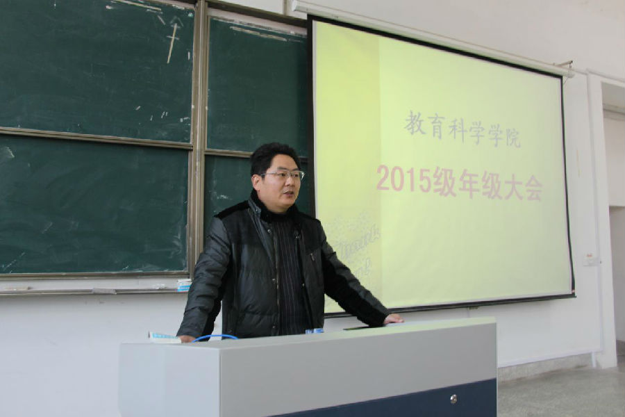 在9号楼302召开2015级普本学生年级大会。教科院党总支副书记、副院长徐红波做了“提高警惕、共防诈骗”以及“诚信考试、阳光教科”两个专题讲座。辅导员赵敬龙老师对新生的日常工作提了一些要求,会议结束后还专门组织了“网络安全考试”。