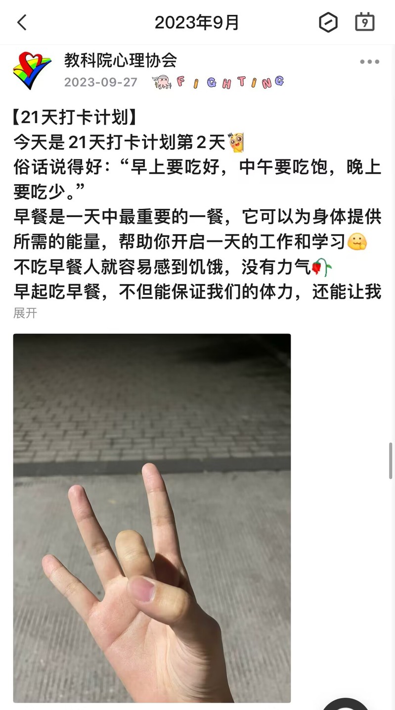 为更好地培养同学们的生活习惯,养成健康的作息规律,ACG动漫 心理协会于9月26日开始举办了为期21天的以“早餐为燃料,祝你飞更高”为主题的打卡活动。